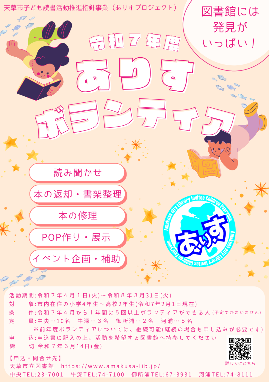 募集人数:中央図書館・・・10人 牛深図書館・・・3人 御所浦図書館・・・2人 河浦図書館・・・5人