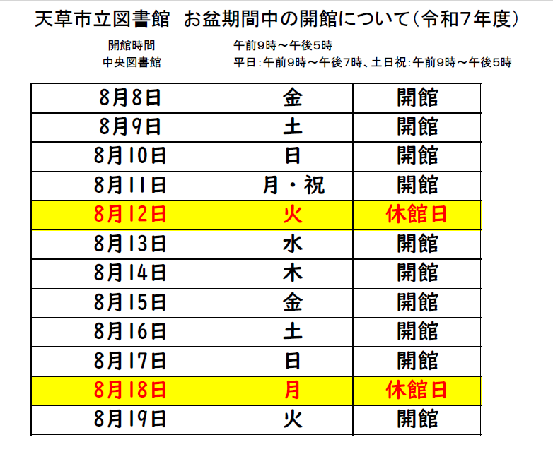天草市立図書館は、お盆期間中も通常通りの開館です。