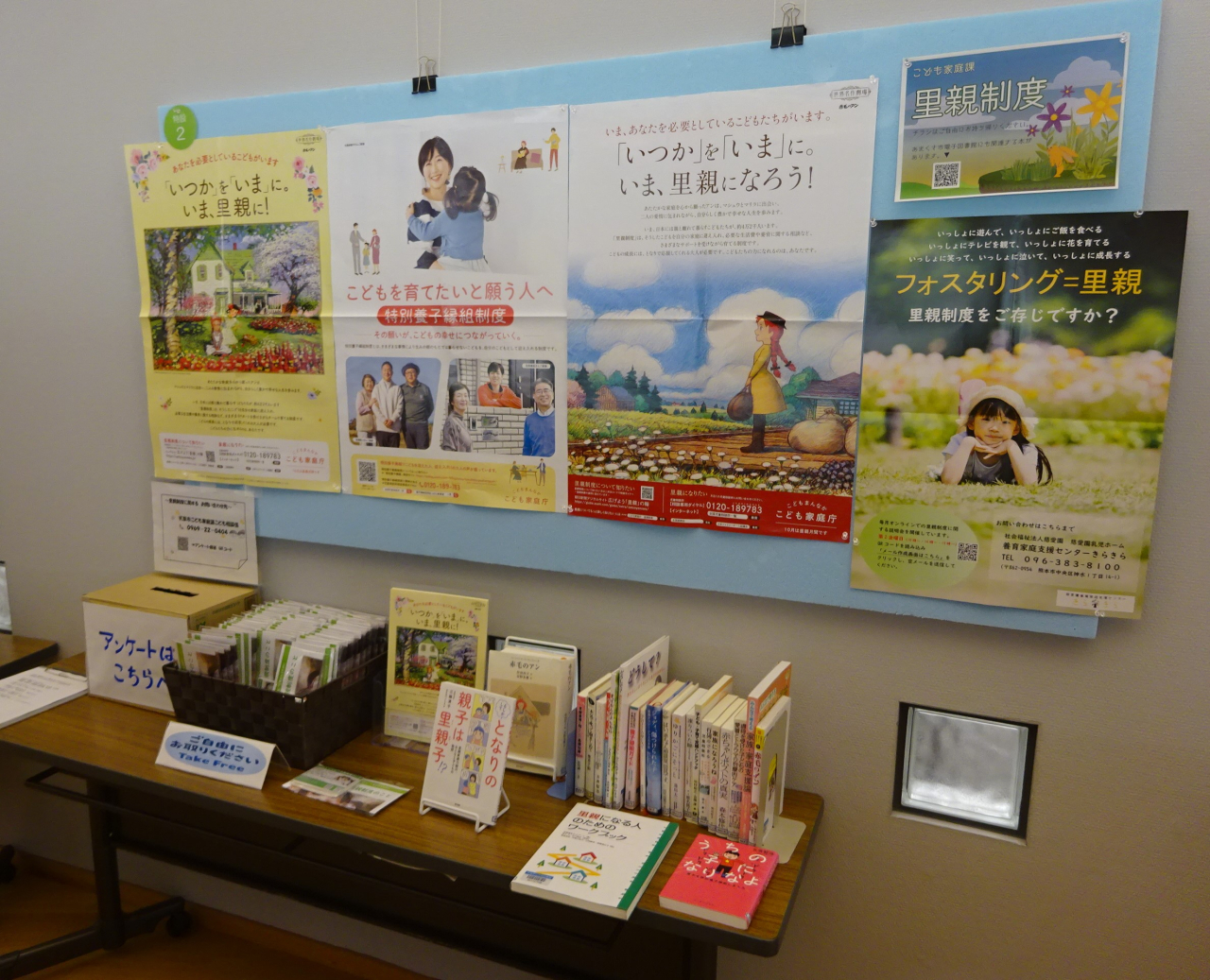 こども家庭課による「里親制度」についてのパネルの展示や映像の上映を、複合施設ここらすで行っており、中央図書館でも関連図書のコーナーを設置しています。