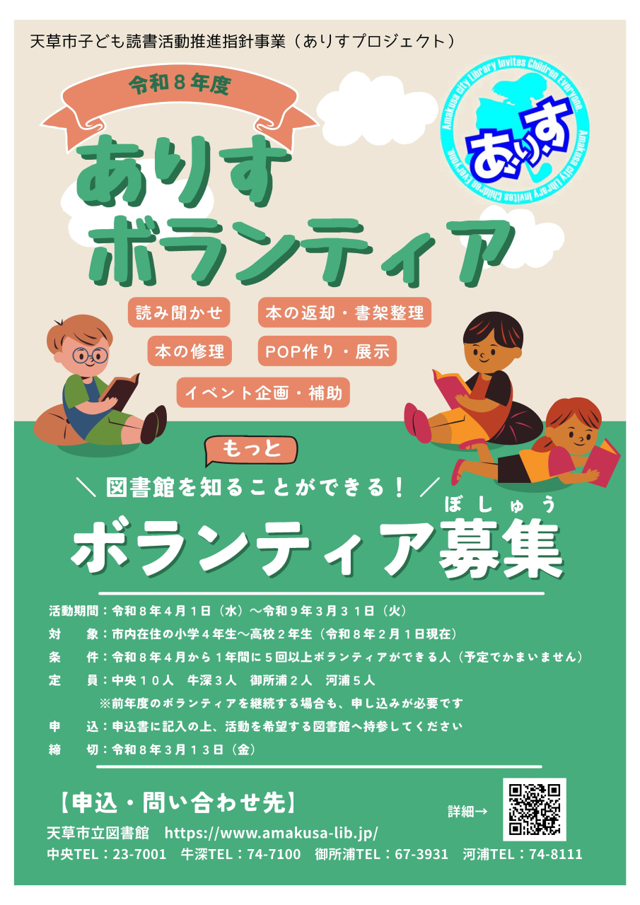 募集人数:中央図書館・・・10人 牛深図書館・・・3人 御所浦図書館・・・2人 河浦図書館・・・5人