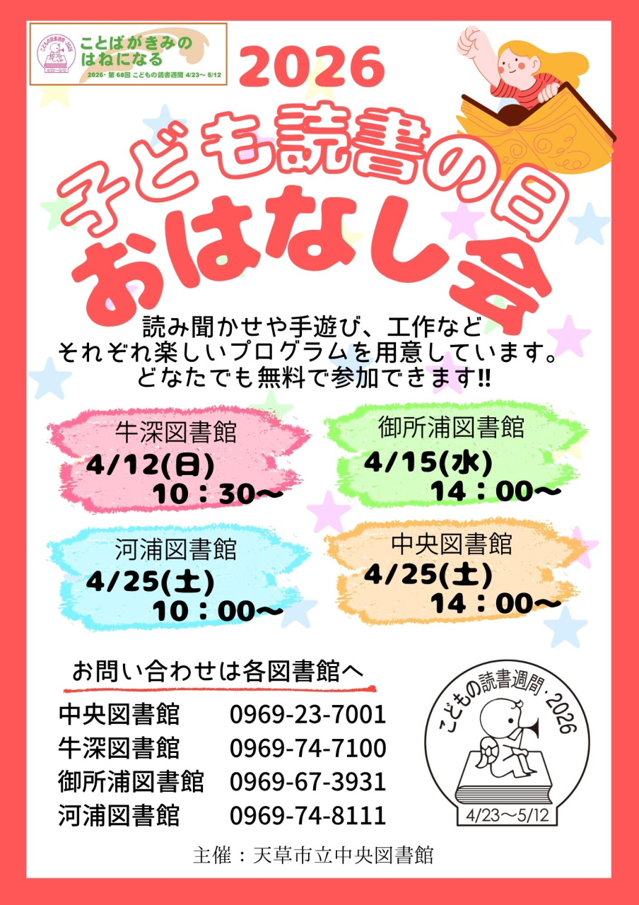 毎年4月23日は「子ども読書の日」、同日から5月12日までは「こどもの読書週間」になっています。これを記念して、天草市立図書館各館では「子ども読書の日おはなし会」を開催します。