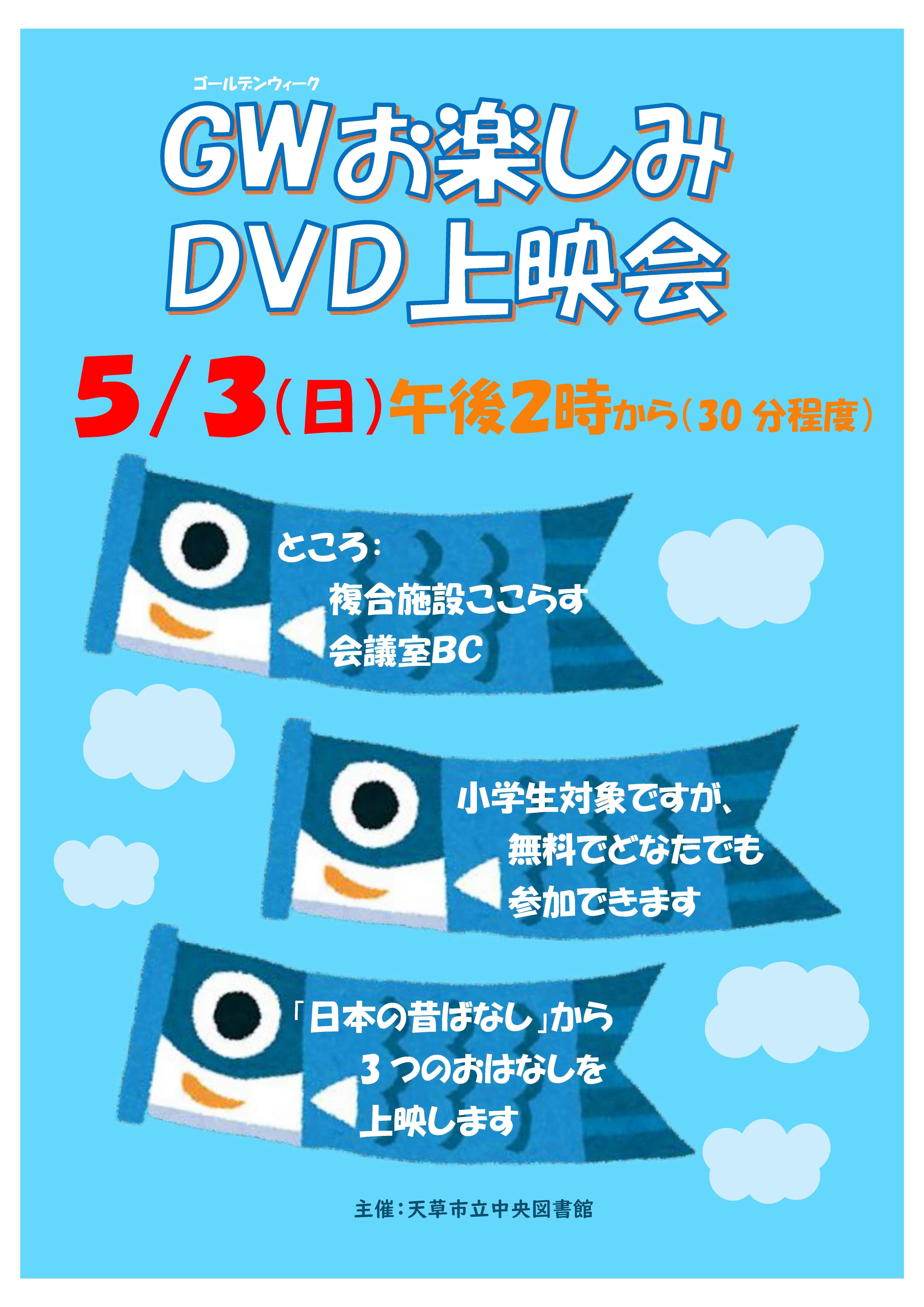 中央図書館では、子どもたちに図書館でおはなしを楽しんでもらうために、DVD上映会を開催します。