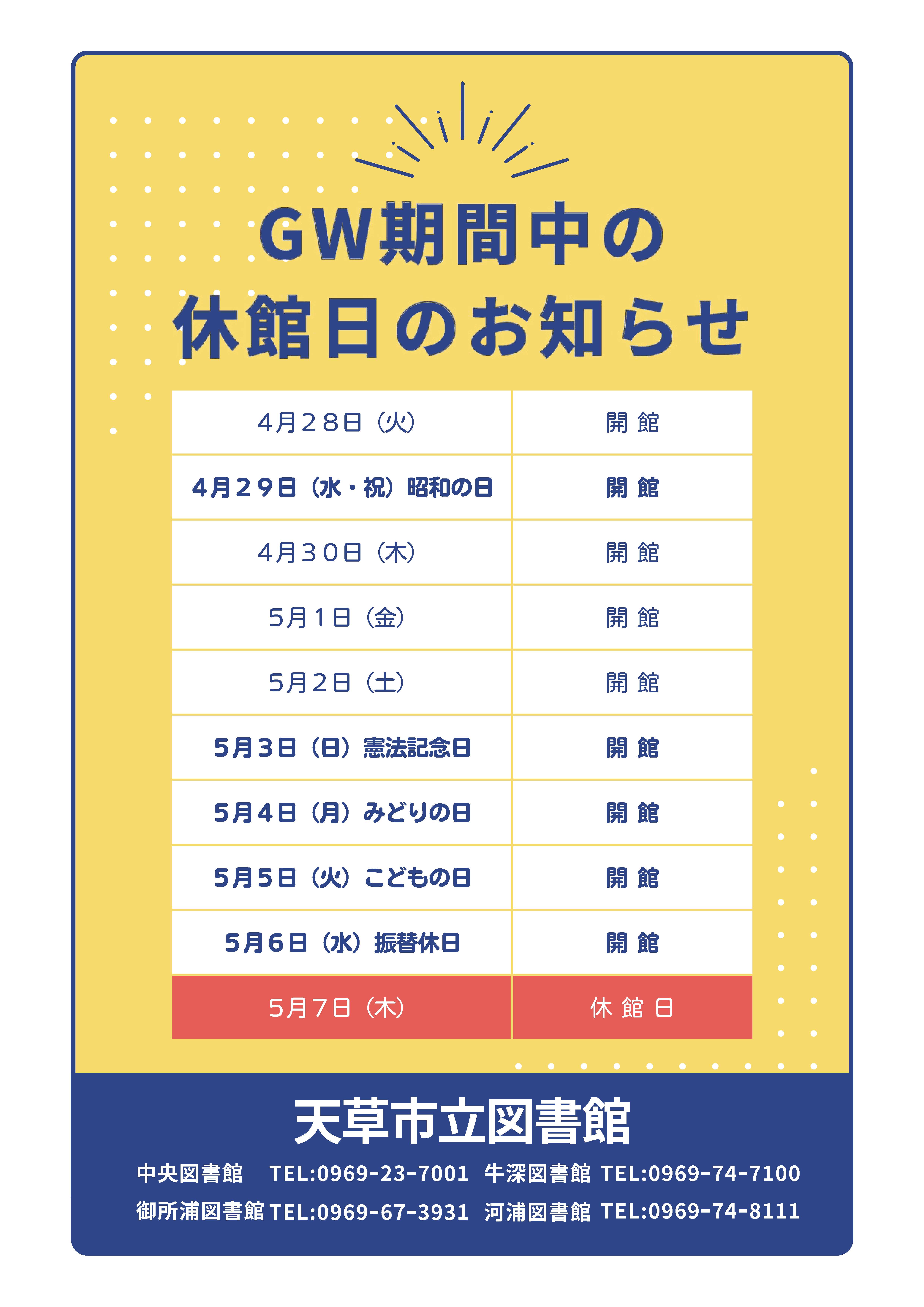 ゴールデンウィーク期間中、市立図書館の休館日は以下のとおりです。